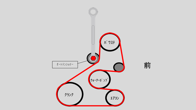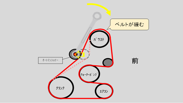 オートテンショナーにロングメガネレンチをかけて前側に引くとベルトが緩みます。